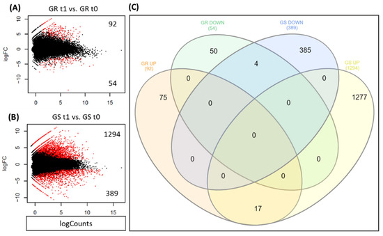 The differential expression analysis from RNA-seq study of Lolium multiflorum (A) glyphosate-resistant (GR) and (B) glyphosate-sensitive (GS) biotypes in response to glyphosate treatment represented in a MA plot (A,B) and Venn diagram (C). Black dots represent non-significant expression, while red dots indicate significant expression. The expression threshold was a p-value and false discovery rate (FDR) of ≤0.05, and log2 FC ≥2 (up-regulated) or ≤log2 FC (down-regulated). In the MA plots, the X-axis (M) corresponds to the mean of normalized counts and the Y-axis (A) to the log2 fold-change for each contig. t1 means with glyphosate treatment and t0 without treatment. Two biotypes originating from the same geographical region (São Valentin, RS, Brazil) were used, one GR and the other GS.