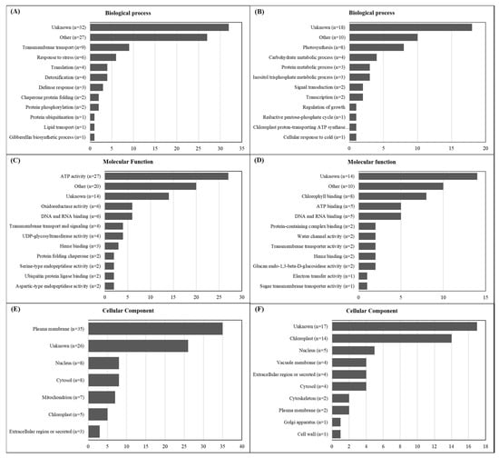 The gene ontology analysis performed for the 146 DEGs (92 up- and 54 downregulated) from the GR biotype in response to glyphosate treatment indicated that on average, 28.1% of the genes were from unknown processes from all three categories (biological processes, molecular functions, and cellular components) (Figure 5). For upregulated characterized genes, transmembrane transport (n = 9, 9.8%) and response to stress (n = 6, 6.5%) presented the highest number in biological processes; ATP activity (n = 27, 29.3%) and oxidoreductase activity (n = 6, 6.5%) in molecular functions; and plasma membrane (n = 35, 38%) and nucleus/cytosol (n = 8, 8.7% each) were the most representative gene ontologies in cellular components (Figure 5A,C,E). The same comparisons for downregulated genes showed that photosynthesis (n = 8, 14.8%) and carbohydrate metabolic process (n = 4, 7.4%) had the highest number of genes in biological processes; chlorophyll-binding (n=8, 14.8%) and ATP binding (n = 5, 9.3%) in molecular functions; and chloroplast (n = 14, 25.9%) and nucleus (n = 5, 9.3%) in cellular components (Figure 5B,D,F).