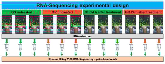 The RNA-seq experimental design included six biological replicates each of the GR and GS biotypes, three with glyphosate treatment (2160 g ae. ha−1) and three without treatment, giving a total of 12 plants. Three plants of each GR and GS biotypes were treated with glyphosate at 2160 g ae ha−1, according to the method described above. At 24 h after treatment, the second and third leaves (from the apex) from all treated and non-treated plants were harvested and immediately frozen in liquid nitrogen and stored at −80 °C. Each plant formed an individual sample (Figure 6).