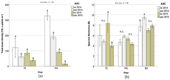 Weed total density (a) and species richness (b) as affected by ASC and Year factors at different plant growing stages. Different Roman letters indicate significant different weight according to lsmeans; n.s.: not significant. ASC: agroecological service crop; TE: termination; PG: plant growth; EH: end of harvest.
