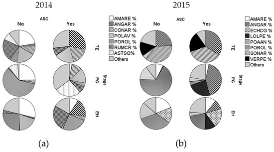 Weed species relative density at each stage in ASC no (No) and ASC yes (Yes) in 2014 (a) and in 2015 (b). ASC: agroecological service crop; TE: termination; PG: plant growth; EH: end of harvest; ‘No’ refers to the ASC no, i.e., fallow plots, without ASCs and ‘Yes’ to ASC yes, i.e., presence of ASCs. AMARE: Amaranthus retroflexus L.; ANGAR: Anagalllis arvensis L.; CONAR: Convolvulus arvensis L.; ECHCG: Echinochloa crus-galli (L.) P.Beauv.; LOLPE: Lolium perenne L.; POAAN: Poa annua L.; POLAV: Polygonum aviculare L.; POROL: Portulaca oleracea L.; RUMCR: Rumex crispus L.; SONAR: Sonchus arvensis L.; ASTSQ: Symphyotrichum squamatum (Sprengel) Nesom; VERPE: Veronica persica Poir.