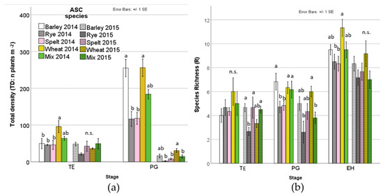 The ASC species influenced the total density at TE in 2014 and PG in both years. Wheat shows the highest weed density in 2014, whereas rye and spelt shows the lowest value, together with mix, at PG both years (Table 4, Figure 3a). No significant differences among ASC species in weed cover are observed at EH ranging between 75.0% (spelt) and 87.5% (wheat) in 2014 and between 18.8% (mix) and 46.7% (barley) in 2015 (data not shown). The ASC species influenced species richness at the TE in 2015, at PG in both years and at EH in 2014 (Table 4, Figure 3b). Rye shows the lowest species richness together with wheat at TE in 2015, with spelt in 2014 and with mix in 2015 at PG and with spelt at EH in 2014 (Figure 3b).