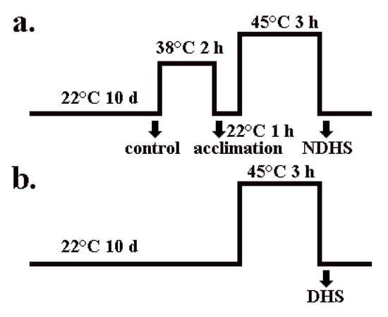Diagrammatic sketch of the heat shock process. (a) The process of heat shock with heat acclimation; (b) the process of heat shock without heat acclimation. The black arrow indicates where the samples were harvested. NDHS: Non-direct heat shock; DHS: Direct heat shock.