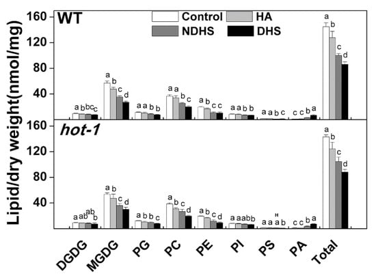 Previous studies have mainly attributed the increased thermotolerance of plants to the accumulation of HSPs during heat acclimation. However, whether and how membrane lipids respond to this process has seldom been investigated [,,]. In addition, whether HSPs affect membrane lipids during this process is also not clear. In the heat shock experiments, neither wild-type Arabidopsis nor hot-1 could survive without heat acclimation, whereas wild-type Arabidopsis survived with heat acclimation (Figure S1) []. We profiled glycerolipids throughout the whole process: Control, heat acclimation, non-direct heat shock (NDHS, heat shock after heat acclimation), and direct heat shock (DHS, heat shock without acclimation) (Figure 1). A glycerolipids analysis indicated that the contents and alterations of glycerolipids were very similar in wild-type Arabidopsis and hot-1 after heat acclimation (Figure 2). In wild-type Arabidopsis and hot-1, the content of total glycerolipids decreased by approximately 11.87% and 13.15% separately after heat acclimation (Figure 2). In wild-type Arabidopsis, the contents of PG, PC, PS, PI, and PA did not change after heat acclimation, whereas that of MGDG, PE, and DGDG decreased. The contents of MGDG, PE, and DGDG decreased by approximately 16.49%, 14.60%, and 10.24% separately. In hot-1, the contents of PI, PS, PA, and DGDG did not change after heat acclimation, but that of MGDG, PG, PC, and PE decreased. The contents of MGDG, PG, PC, and PE decreased by approximately 11.65%, 15.07%, 19.83%, and 14.20% separately. Overall, heat acclimation led to a decrease in glycerolipids in both wild-type Arabidopsis and hot-1.