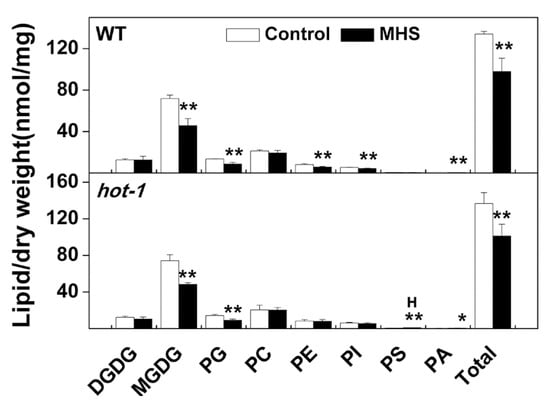 Effects of moderate heat stress on the total content of glycerolipids of various head group classes in wild-type Arabidopsis and hot-1. Values shown are the mean ± SE; n = 4 or 5. Symbols * and ** indicate that the content of glycerolipids under moderate heat stress differed significantly from that under ambient temperature in wild-type Arabidopsis and hot-1 at P ≤ 0.05 and ≤ 0.01, respectively. The letter “H” indicates that the amount of lipid was significantly higher (P < 0.05) in hot-1, compared to wild-type Arabidopsis at the corresponding treatment. MHS: Moderate heat stress.