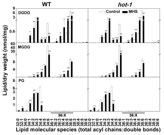 Previous studies have indicated that plastidic lipids are more sensitive to environmental stress than extraplastidic lipids []. However, the response of individual plastidic lipid molecular species to moderate heat stress is not clear. Our data indicated that the contents and alteration of individual plastidic lipid molecular species were almost identical in wild-type Arabidopsis and hot-1 after moderate heat stress (Figure 4). Although the content of MGDG decreased, the content of 36:x MGDG, which contains 36 carbons in two acyl chains and is mainly synthesized through the eukaryotic pathway, increased by approximately 29.71% and 18.16% separately under moderate heat stress in wild-type Arabidopsis and hot-1 (Figure 4). This increase involved all 36:x MGDG (total acyl chains: Double bonds) molecular species except for 36:6 MGDG. The content of 34:6 MGDG, which is synthesized through the prokaryotic pathway, decreased by approximately 58.81% and 54.67% separately under moderate heat stress in wild-type Arabidopsis and hot-1. However, the other 34:x MGDG molecular species showed slight increases or no change during moderate heat stress. In contrast to the change in MGDG, the total DGDG content did not change under moderate heat stress in both wild-type Arabidopsis and hot-1 (Figure 3). However, the DGDG composition underwent a profound alteration (Figure 4). The contents of 36:6 and 34:6 DGDG, both of which have more double bonds, decreased significantly in both wild-type Arabidopsis and hot-1. Other molecular species, such as 36:5, 36:4, and 34:2 DGDG, all increased during moderate heat stress. The decrease in total PG was mainly due to the decrease in 34:4 PG, which is also synthesized through the prokaryotic pathway, in both wild-type Arabidopsis and hot-1. From the observed alteration of plastidic lipids, we know that the molecular species of plastidic lipids changed profoundly during moderate heat stress.