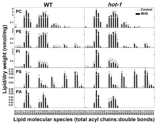 In this work, we examined the leaf glycerolipids of wild-type Arabidopsis (Col) and its HSP101 T-DNA insertion mutant hot-1 under two types of heat stress: Moderate heat stress (MHS; 30 °C, 18 days) and heat shock (HS; 45 °C, 3 h), which have commonly been applied in previous studies []. A lipidomic analysis based on electrospray tandem mass spectrometry (ESI-MS/MS) was used to profile the molecular species of glycerolipids []. Although heat acclimation, a process including the pre-exposure of plants to sublethal temperatures, led to a slight decrease in glycerolipids, it reduced the degradation of glycerolipids under heat shock. However, the remodelling of plastidic lipids, severely suppressed the prokaryotic pathway and slightly enhanced the eukaryotic pathway, that occurred during moderate heat stress. Our research also indicated that HSP101 had a minor effect on the alteration of membrane lipids under both types of heat stress.