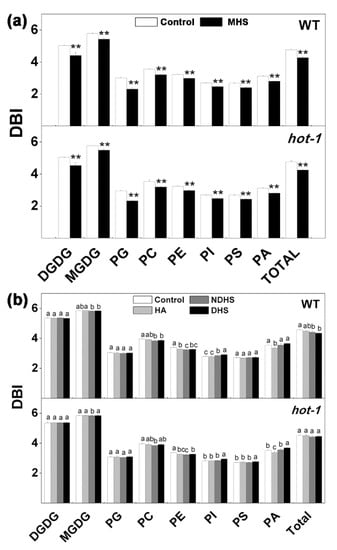Previous studies have indicated that temperature can induce a change in the double bond index (DBI), with high temperature leading to a decrease in the DBI and low temperature leading to an increase [,,,]. Our results were consistent with previous studies: The DBI of total lipids decreased by approximately 10.47% and 10.72% separately under moderate heat stress in wild-type Arabidopsis and hot-1 (Figure 6a). A careful analysis indicated that the DBI of each class of glycerolipids all decreased under moderate high temperature in both wild-type Arabidopsis and hot-1 (Figure 6a). Among plastidic lipids, the DBI of PG decreased the most in both wild-type Arabidopsis and hot-1, by about 23.00% and 21.29%, respectively. In contrast, the DBI of MGDG decreased the least in both wild-type Arabidopsis and hot-1, about 6.07% and 4.68%, respectively. The DBI of all extraplastidic lipids decreased by approximately the same extent in both wild-type Arabidopsis and hot-1 under moderate heat stress (Figure 6a). Under heat shock, the DBI of glycerolipids changed slightly in both wild-type Arabidopsis and hot-1 (Figure 6b). The DBI of total glycerolipids did not change during heat acclimation and decreased slightly after NDHS or DHS in wild-type Arabidopsis, whereas the DBI of total glycerolipids did not change during the whole process of heat shock.
