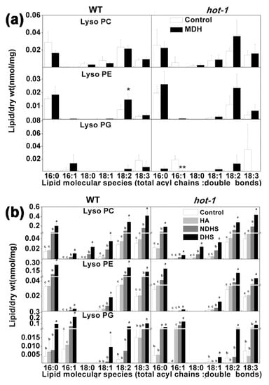 Previous studies have confirmed that LysoPLs act as secondary signal messengers in plant signalling [,,]. They are involved in many important physiological processes, such as cell elongation, shoot gravitropism, and pollen maturation []. The changes in lysophospholipids under heat stress were investigated in the present study (Figure 7). Under moderate heat stress, the content of all LysoPL species almost did not change in both wild-type Arabidopsis and hot-1, except 18:2 Lyso PE in wild-type Arabidopsis and 16:1 LysoPG in hot-1 (Figure 7a). Under heat acclimation, the content of LysoPLs also did not increase. However, the content of LysoPL species increased dramatically after heat shock (both NDHS and DHS) in both wild-type Arabidopsis and hot-1 (Figure 7b). The increase in the content of LysoPLs after NDHS was lower than the increase in LysoPLs after DHS. The increase in the content of LysoPLs involved all LysoPLs species (Figure 7b). These results indicated that LysoPLs respond actively to heat shock.