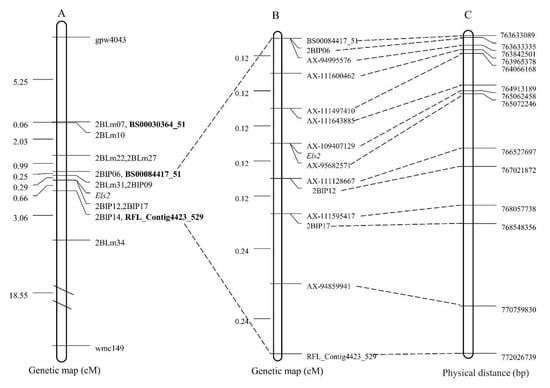 The Els2-flanking KASP markers BS00084417_51 and RFL_Contig4423_529 were used to identify recombinants in the F2 mapping population of the LF2099 × Chinese Spring cross. Only nine recombinant individuals were identified from 838 F2 individuals. Other molecular markers, including the previously reported IP markers 2BIP06, 2BIP12 and 2BIP17 [], were then analyzed with these recombinants only. The F2:3 families produced by selfing the recombinant F2 plants were used to further estimate phenotypes. In combination with the marker genotypes and recombinant phenotype, a high-resolution genetic map around the Els2 locus was eventually constructed (Figure 2B). Among the markers flanking the Els2 gene, the KASP markers AX-111643885 and AX-111128667 were the most closely linked, at distances of 0.12 and 0.12 cM, respectively. Two KASP markers, AX-109407129 and AX-95682571, co-segregated with the Els2 gene.