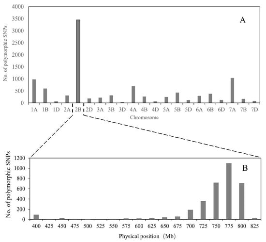 Number of polymorphic single nucleotide polymorphisms (SNP) distributed on different wheat chromosomes (A) and distribution of SNP variants on chromosome 2B (B).