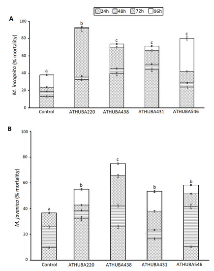 Percentage (mean± standard error) of J2 mortality in M. incognita (A) and M. javanica (B) after 96 h of immersion into solvent extracts from different Streptomycetes solid cultures as depicted. The control wells contained 70 μL of J2 s suspension. Different letters above columns correspond to statistically significant differences between treatments (one-way ANOVA, Tukey’s test at p < 0.05; for all cases n = 15–20).