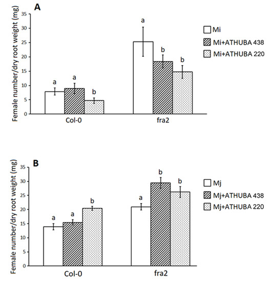 Arabidopsis thaliana L. plants (Col-0) and fra2 katanin mutants root infestation levels expressed as female number/dry root weight (mg) with M. incognita (Mi)(A) and M. javanica (Mj) (B) 45 Days after application of treatments. The treatments were performed with Streptomyces monomycini ATHUBA 220 and Streptomyces colombiensis ATHUBA 438 at 107 cells/g of soil. Different letters above columns correspond to statistically significant differences between treatments (one-way ANOVA, Tukey’s test at p < 0.05; for all cases n = 10).