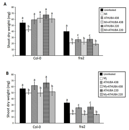 Arabidopsis thaliana L. plant (Col-0) and fra2 katanin mutants shoot dry weight (mg), of control (uninfested), infested with either M. incognita (A) or M. javanica (Mj) (B) or treated with Streptomyces monomycini ATHUBA 220 and Streptomyces colombiensis ATHUBA 438 spore suspensions at 107 cells/g of soil (prior Mi/Mj infection or not). 45 days after application of the depicted treatments/infections. Different letters above columns correspond to statistically significant differences between treatments (one-way ANOVA, Tukey’s test at p < 0.05; for all cases n = 10).