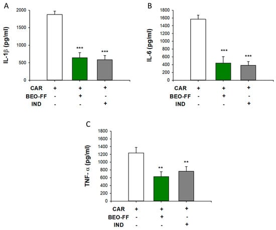Effects of BEO-FF on the release of pro-inflammatory cytokines induced by CAR. Rats were treated with 86.2 mg/kg (100 μL) of BEO-FF 1 h before the intraplantar injection of CAR, and, after 5 h, the subcutaneous tissue of hind paw was removed and homogenized. Levels of interleukin (IL)-1β (A), IL-6 (B), and tumor necrosis factor (TNF)-α (C) in the paw homogenates were determined by ELISA. Data are presented as mean ± SEM of the values found in five animals per group. ** p < 0.01 and *** p < 0.001 vs. CAR group.