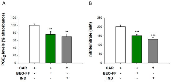 As shown in Figure 2, the systemic treatment (i.p.) with BEO-FF 86.2 mg/kg 1 h before the CAR injection led to a significant reduction of prostaglandin E2 (PGE2) levels (≈30%) and NO production in paw exudates (* p < 0.05 vs. CAR group), as observed through ELISA assay and Griess reaction, respectively. These results are comparable with those of the IND group.