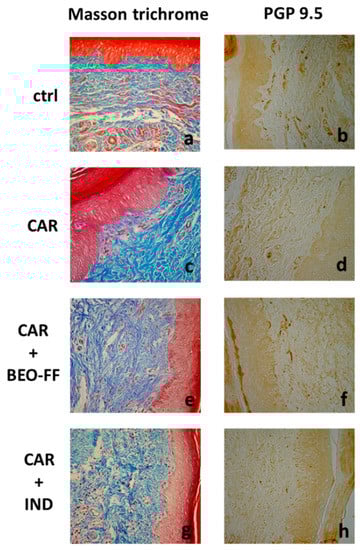 BEO-FF ameliorated the pathological features typical of edema. Five hours after CAR injection, rats were sacrificed, the hind paws were removed, and their sections were examined by optical microscopy. Representative photos of paw specimens from animals belonging to control (a,b), CAR-inflamed (c,d), pre-treated with BEO-FF (e,f), or indomethacin (IND) (g,h) groups stained with Masson trichrome or a rabbit polyclonal antibody against PGP 9.5. Original magnification: ×40.
