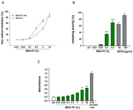 Antioxidant activity of BEO-FF. (A) 2,2-Diphenylpicrylhydrazyl (DPPH) free-radical scavenging test; (B) chelating activity assay; (C) ferric reducing power assay. Data are the mean ± SEM of three experiments performed in triplicate. * p < 0.05, ** p < 0.01, and *** p < 0.001 vs. controls.