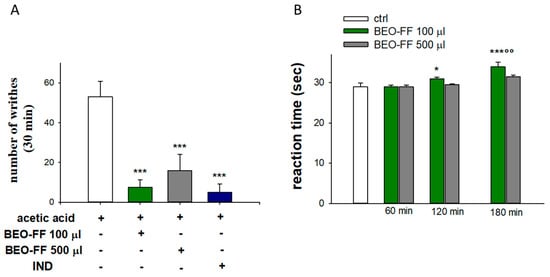 Analgesic effect of BEO-FF in mice. (A) Peripheral anti-nociceptive activity of BEO-FF (86.2 or 431.2 mg/kg) evaluated by the writhing test, showing the significant inhibition of constrictions by BEO-FF in mice receiving acetic acid (1.2%). Data are expressed as number ± SEM of writhes. ** p < 0.01 and *** p < 0.001 vs. control. (B) BEO-FF (86.2 mg/kg) increased the time of reaction in the hot-plate test. Results are expressed as mean ± SEM of latency time (second). * p < 0.05 and *** p < 0.001 vs. control; °° p < 0.01 vs. 120 min.