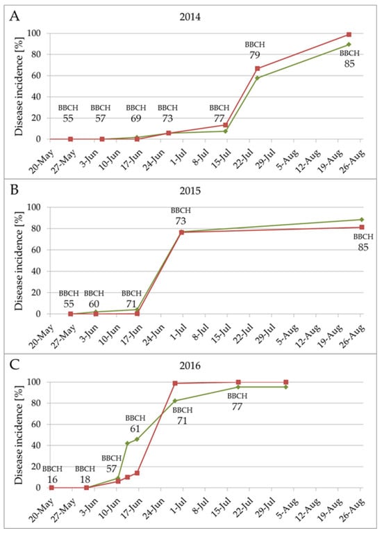 Epidemiology of P. viticola differed in the years 2014, 2015, and 2016. Graphs show the disease incidence of P. viticola on V. vinifera cultivar (cv.) Mueller–Thurgau in the vegetation periods 2014 (A), 2015 (B), and 2016 (C). Green line represents results for leaves, red lines for grapes. Observation in 2016 was stopped on August 3rd due to incidence of >95%.