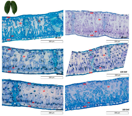 At 30, 60, 90, 120, 150, and 180 DAT, 0.5 cm2 samples were collected from the middle third of the leaves using disposable razor blades. These samples were fixed in Karnovsky [34] solution for 24 h, dehydrated in an increased series of ethanol, and pre-infiltrated and infiltrated in historesin (Historesin-Leica), following the manufacturer’s protocol. Traverse sections, 5 µm thick, were then obtained in a rotary microtome (Model 1508R). The sections were stained with 0.05% toluene blue (polyacromatic toluidinacoloration) in 0.1 M phosphate buffer, at pH 6.8 for structural and micromorphometric analyses [35]. The sections were obtained from one plant per repetition.