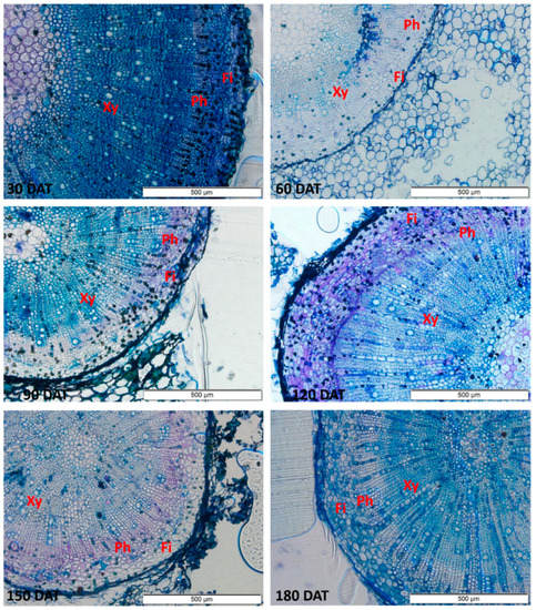 The anatomical sections show vessels with larger diameters in the stem, which increased progressively up to 150 DAT (Figure 4). In the root (Figure 5), a progressive increase was observed up to 120 DAT, but the diameter subsequently declined significantly.
