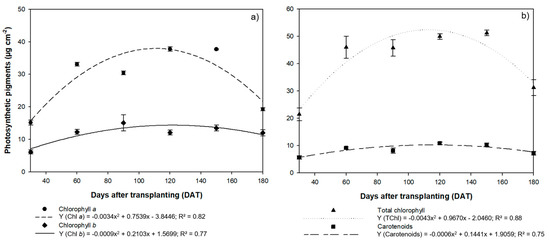The concentration of photosynthetic pigments in the H. courbaril plants also varied quadratically (Figure 6a,b). The highest mean Chla and carotenoid concentrations were recorded at 120 DAT and 150 DAT, with 37.76 µg cm−2 for Chla at 120 m DAT and 37.78 µg cm−2 at 150 DAT, and carotenoids at 10.83 µg cm−2 and 10.25 µg cm−2, respectively, with a drastic reduction at 180 DAT to 19.25 µg cm−2 for Chla and 7.12 µg cm−2 for carotenoids. The highest mean Chlb and TChl concentrations were also recorded at 150 DAT (13.48 µg cm−2 and 51.17 µg cm−2), followed, once again, by a reduction at 180 DAT, to 12.03 µg cm−2 for Chlb and 31.15 µg cm−2 for TChl.