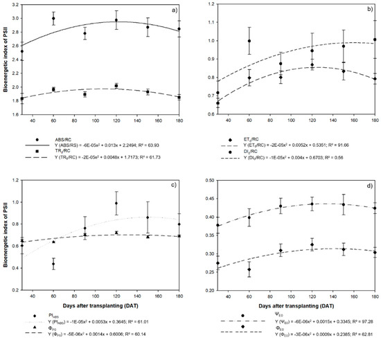 Similarly, we observed a reduction in the flux of electrons per reaction center (ET0/RC) after 120 DAT, which also indicates a stress scenario, given that this flux is typically reduced in plants under stress from salinity or metals, for example (see [57,58,59]). By contrast, there was a progressive increase in the dissipation of energy in the form of heat (DI0/RC) at 150 DAT and 180 DAT, which is also consistent with the effects of stress on the plant. Under stress, a proportion of the reaction centers (DI0/RC) become dissipative centers to avoid photo-oxidative damage to the photosynthetic apparatus (e.g., [60,61]).