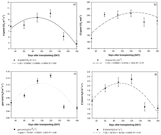 The pattern of variation observed in the fluorescence data was also reflected in the photosynthetic rate (A), internal CO2 concentration (Ci), stomatal conductance (gsw), and transpiration rate (E). These parameters also followed a quadratic model, and all peaked at 120 DAT, and subsequently decreased. The photosynthetic rate (A) peaked at 10.11 µmol of CO2 m−2 s−1, decreasing to 6.14 µmol of CO2 m−2 s−1 at 150 DAT and 4.87 µmol of CO2 m−2 s−1 at 180 DAT (Figure 8a). The Ci concentrations reached a maximum of 246.7 µmol of CO2 m−2 s−1 at 120 DAT, declining to 220.2 µmol of CO2 m−2 s−1 at 150 DAT and 223.6 µmol of CO2 m−2 s−1 at 180 DAT (Figure 8b).
