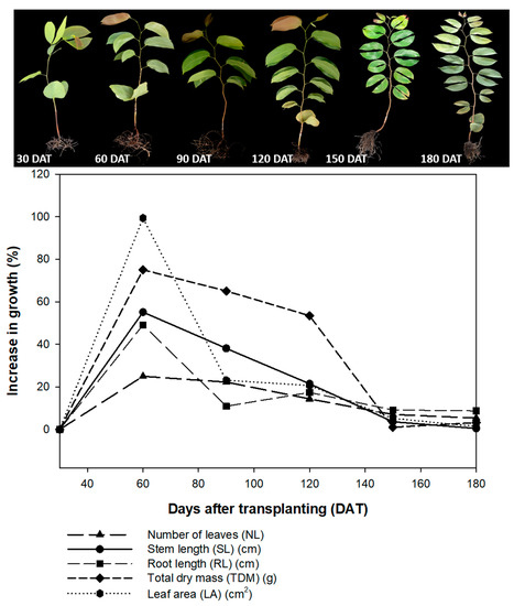 The percentage growth of the seedlings was calculated for the stem length (SL), stem diameter (SD), number of leaves (NL), maximum root length (RL), leaf area (LA), and total dry mass (TDM). The values were obtained by the equation: