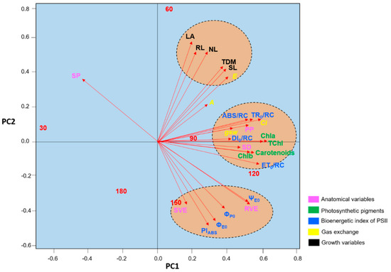 Plot of the results of the principal components analysis of the anatomical variables, photosynthetic pigments, chlorophyll a fluorescence parameters, gas exchange, and growth of the seedlings of Hymenaea courbaril L. cultivated in a hydroponic system and sampled at 30-day intervals across their initial development (30, 60, 90, 120, 150, and 180 days after transplantation).