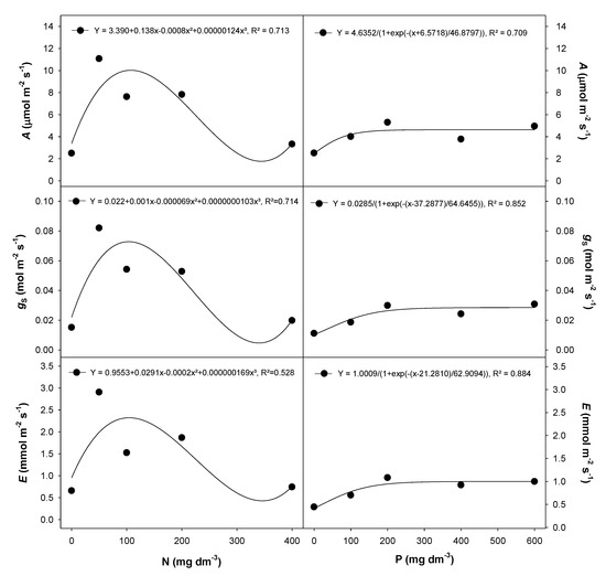 The N (0, 50, 100, 200 and 400 mg dm−3) and P (0, 100, 200, 400 and 600 mg dm−3) rates used in this study differentially influenced gas exchange and chlorophyll a fluorescence traits in E. dysenterica seedlings. The photosynthetic rate (A), stomatal conductance (gS) and transpiration (E) were lowest in plants grown in the absence of N or at the highest N rate (400 mg dm−3) (Figure 1). Each of these measured parameters showed a dramatic initial increase with the first increment of N fertilizer (50 mg dm−3) and then dropped at the highest rate (400 mg dm−3). Similarly, the P response increased with the first increment of fertilizer (100 mg dm−3 P); however, it differed as the response plateaued with increasing P rates (Figure 1).