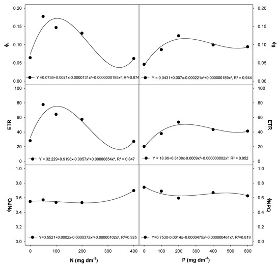 Chlorophyll a fluorescence traits in E. dysenterica seedlings grown at varying rates of nitrogen and phosphorus. Effective quantum yield of photosystem II (ΦPSII), electron transport rate (ETR) and regulated quantum yield of nonphotochemical energy dissipation (ΦNPQ) in Eugenia dysenterica DC seedlings grown at varying rates of nitrogen (N) and phosphorus (P) for 278 d. Dots represent mean (n = 4). Means and SEM are shown as Supplementary Material (Table S2).