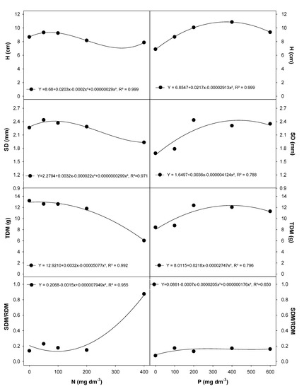 Morphological traits in E. dysenterica seedlings grown at varying rates of nitrogen and phosphorus. Height (H), stem diameter (SD), total dry matter (TDM), and the ratio between shoot dry matter and root dry matter (SDM/RDM) in Eugenia dysenterica DC seedlings grown at varying rates of nitrogen (N) and phosphorus (P) for 278 d. Dots represent mean (n = 4). Means and SEM are shown as Supplementary Material (Table S3).