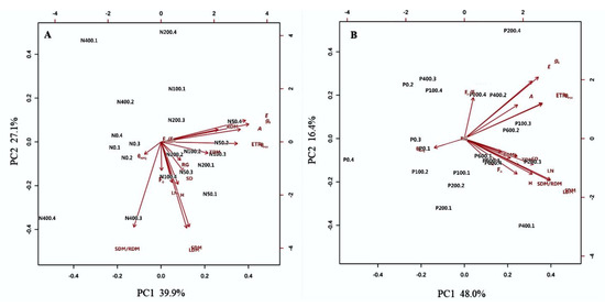Principal component analysis (PCA) of the physiological and morphological parameters of E. dysenterica at varying nitrogen and phosphorus rates. Principal component analysis (PCA) of the mean values for the physiological and morphological characteristics of Eugenia dysenterica DC grown at varying (A) nitrogen (N; 0, 50, 100, 200, and 400 mg dm−3) and (B) phosphorus (P; 0, 100, 200, 400, and 600 mg dm−3) rates for 278 d. Images A and B show score variations in these traits along the first two main component axes, with the percentage of variation explained.