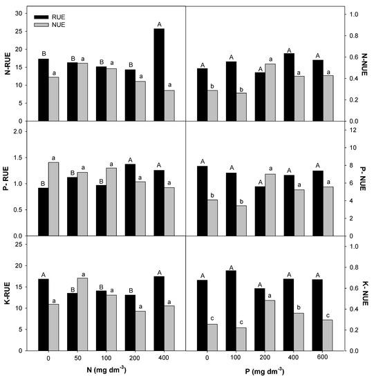 Based on these findings, the nutrients were determined on a dry matter basis (in g plant−1) and multiplied by the nutrient content (in g and mg for macronutrients and micronutrients, respectively). Using the results of the dry matter and nutrient contents in the plant, the root uptake efficiency (RUE) and plant nutrient use efficiency (NUE) indexes were calculated according to Swiader et al. [62] and Siddiqi and Glass [63], respectively, using the following equations: