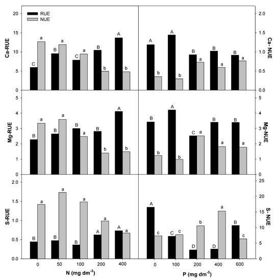 Root uptake efficiency (RUE) and nutrient use efficiency (NUE) for calcium (Ca), magnesium (Mg), and sulfur (S) in E. dysenterica seedlings. Root uptake efficiency (RUE, mg g−1) and plant nutrient use efficiency (NUE, g2 mg−1) for the macronutrients Ca, Mg, and S in Eugenia dysenterica DC seedlings grown at varying rates of nitrogen and phosphorus for 278 d. Bars represent means (n = 4). Means followed by the same letters, uppercase for RUE and lowercase for NUE, do not differ by the Scott-Knott clustering test (p > 0.05).