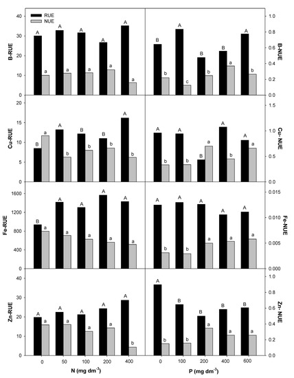 Root uptake efficiency (RUE) and nutrient use efficiency (NUE) for micronutrients in E. dysenterica seedlings. Root uptake efficiency (RUE, mg g−1) and plant nutrient use efficiency (NUE, g2 g−1) for the micronutrients boron (B), copper (Cu), iron (Fe), and zinc (Zn) in Eugenia dysenterica DC seedlings grown at varying rates of nitrogen and phosphorus for 278 d. Bars represent means (n = 4). Means followed by the same letters, uppercase for RUE and lowercase for NUE, do not differ by the Scott-Knott clustering test (p > 0.05).