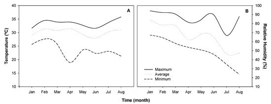 The experiments were carried out in a glasshouse of the Plant Tissue Culture Laboratory of IF Goiano, Rio Verde, Goiás, Brazil. Temperature and humidity conditions during the experimental period were recorded using a data logger (Novus, model LogBox-RHT-LCD, Porto Alegre, RS, Brazil) and are presented in Figure 8.