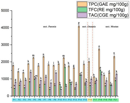 TPC, TFC, and TAC contents of seed extracts from different peony species. Different letters on bars indicate significant difference at p ≤ 0.05 by using Duncan’s test.