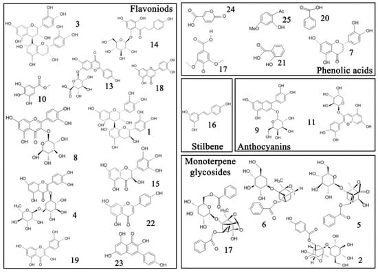 Chemical structures of the 25 common metabolites identified in the seeds of peony species.
