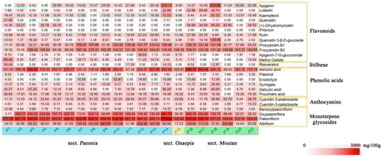 Contrary to the fact that the fatty acids could be used as a chemotaxonomic tool for tree peony and herbaceous peony species, the results of clusters based on phytochemicals are not consistent with taxonomic results. [,]. Species in all three sections are not separated. The phytochemistry of peonies seeds is also affected by both genes and the environment.