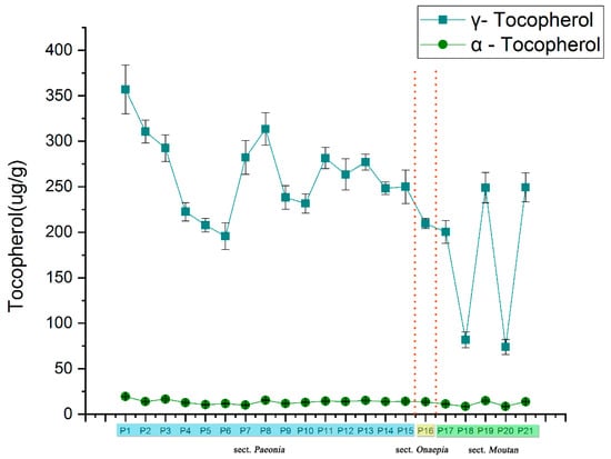 The α- and γ-tocopherol content were determined in all samples by HPLC, as shown in Figure 4. γ-tocopherol was the dominant component in the kernel extracts, with its concentration ranged from 73.91 (P20) to 357.01 (P1) µg/g DW. Previous studies suggest that γ-tocopherol is important to human health []. However, humans and animals do not synthesize γ-tocopherol; moreover, γ-tocopherol is highly abundant in plant seeds. However, the α-tocopherol content was low in the extracts, and the highest content was found in P1 at only 19.32 µg/g. The results agreed with previous reports that the average γ-tocopherol content in herbaceous peony seed oil was 337.47 ± 57.42 µg/g, accounting for approximately 92.97% of the total tocopherol content []. The results showed that the seeds of P. lactiflora and P. anomala subsp. anomala might be further developed as a dietary source of vitamin E.