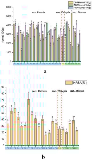 Antioxidant activities of seed extracts from different peony species. (a)DPPH, ABTS, FRAP (b) HRSA. Different letters on bars indicate significant difference at p ≤ 0.05 by using Duncan’s test.