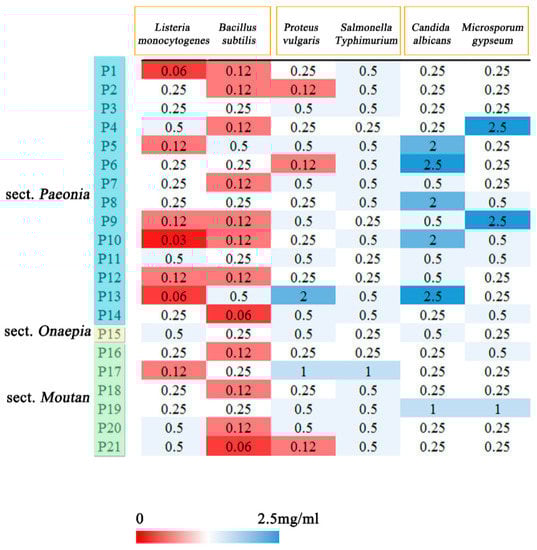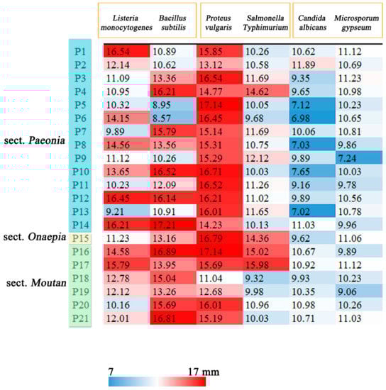 Bacterial resistance is considered as a global public health problem and is necessary for bacteriostasis, therefore, the antibacterial and antifungal activities of extracts were determined. All samples exhibited antimicrobial activities against Gram-positive and Gram-negative bacteria and fungi at different levels. The MIC and IZR values for antimicrobial activity of the extract are listed in Figure 6 and Figure 7 (Details in supplementary Tables S1 and S2). The seed extracts showed strong activity against Gram-positive bacteria (Listeria monocytogenes and Bacillus subtilis); the MIC ranged from 0.03 to 0.5 mg/mL, and the IZR ranged from 8.57 to 17.14 mm. The Listeria monocytogenes is the major foodborne pathogen []. Sun et al. found that the MIC value of blueberry extract was 0.53 mg/mL; it is obvious that peony seeds have a better antibacterial effect than blueberries []. All samples showed relatively weak growth inhibition of fungi (Candida albicans and Microsporum gypseum). For all extracts, the IZR had diameters less than 12 mm. In our research, the samples P12 and P14 showed stronger antibacterial activities against Listeria monocytogenes and Bacillus subtilis than those of the other samples.