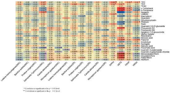 Fifteen compounds were significantly correlated with the antioxidant capacity. There was a significant correlation between apigenin and the Salmonella typhimurium MIC (p = 0.05), between paeoniflorin and the Proteus vulgaris MIC, the Listeria monocytogenes IZR, and the Proteus vulgaris IZR at the p = 0.01 level, while procyanidin B1, paeonol, p-coumalic acid, oxypaeoniflora, and paeoniflorin showed correlations with the ABTS radical scavenging ability (p = 0.05). Previous phytochemical studies have revealed that the kaempfero isolated from Bryophyllum pinnatum showed antimicrobial and antioxidant properties []. Conversely, negative correlations were found between kaempferol and both the Proteus vulgaris IZR and the ABTS radical scavenging ability at p = 0.05 in this experiment. The p-coumalic acid was negatively correlated with the Salmonella typhimurium MIC and the Microsporum gypseum MIC at p = 0.01.