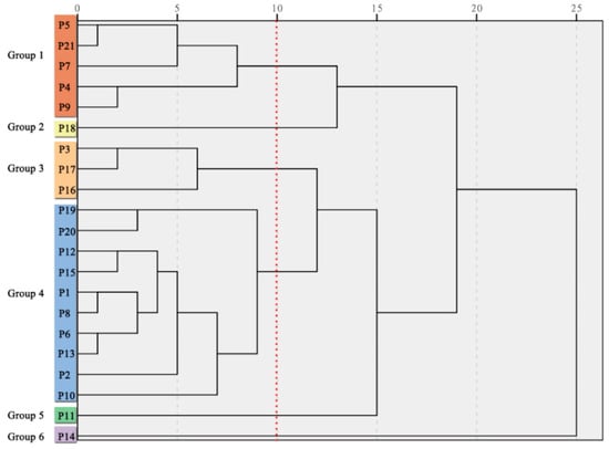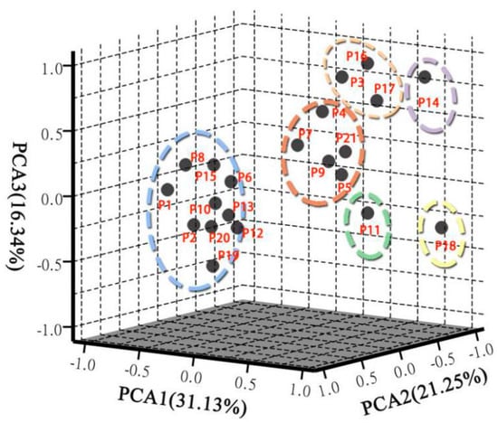 The TPC, TFC, TAC, tocopherol content, and the content of 25 individual chemical compounds obtained from 21 populations were used to establish a hierarchical analysis by SPSS 21.0 software. In terms of the equipartition principle, the 21 populations were classified into 6 groups using Ward’s method (Figure 9). Principal component analysis (PCA) for the 21 peony populations based on the content of the TPC, TFC, TAC, tocopherols, and 25 individual chemical compounds were also established (Figure 10). The first three components had a great percentage (68.72%) of the total variance, and they were three-dimensionally plotted. PCA divided the 21 populations into six groups, including Group 1 (P4, P5, P7, P9, and P21), Group 2 (P18), Group 3 (P3, P16, and P17), Group 4 (P1, P2, P6, P8, P10, P12, P15, P19, and P20), Group 5 (P11), and Group 6 (P14). These results were similar to the sorting of HCA. Approximately 5 populations were grouped into Group 1, and 10 populations were grouped into Group 4; the two groups have no obvious advantage in phytochemical composition (Figure 11). P18 samples were grouped in Group 2, which contains the abundantly phenolic acids and TPC. P3, P17, and P16 were clustered into Group 3, which were characterized by high monoterpene glycosides content. P11 was divided into Group 5 with the highest γ-tocopherol. P14 samples were grouped into Group 6, which was characterized as having the highest monoterpene glycosides and TPC content. As important active compounds in peony plants, the oxypaeoniflora and paeoniflorin contents were highest in P14, with concentrations of 681.74 and 2756.92 mg/100 g DW, respectively. The species of P. mairei should deserve more attention in future research. However, there was no significant difference in the anthocyanin content between the groups.