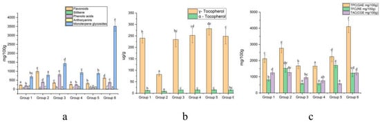 Variations in the content of total metabolite content TPC, TFC, TAC, five metabolite categories, and tocopherols between the six groups. (a) Flavonoids, Stilbene, Phenolic acids, Anthocyanins, Monoterpene glycosides. (b) γ-tocopherol, α-tocopherol. (c) TPC, TFC, TAC. Different letters on bars indicate significant difference at p ≤ 0.05 by using Duncan’s test.