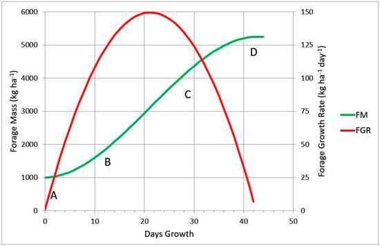 Another way to visualize pasture growth is the daily change in FM. Forage growth rate (FGR, kg DM ha−1 day−1) is the first derivative of FM at a given point, where time is in days: