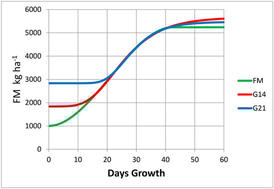 The Gompertz non-linear growth model always calculates an initial slow growth phase. This becomes a systematic error when there is no slow growth phase. The forage mass (FM) line represents the ‘true’ growth rate for a theoretical pasture. The Gompertz model, evaluated over days 14 to 43 (G14) and days 21 to 43 (G21), predicted zero growth at an FM of 1900 and 2900 kg DM ha−1, respectively, while the ‘true’ growth had a low growth rate at an FM of 1000 kg DM ha−1.